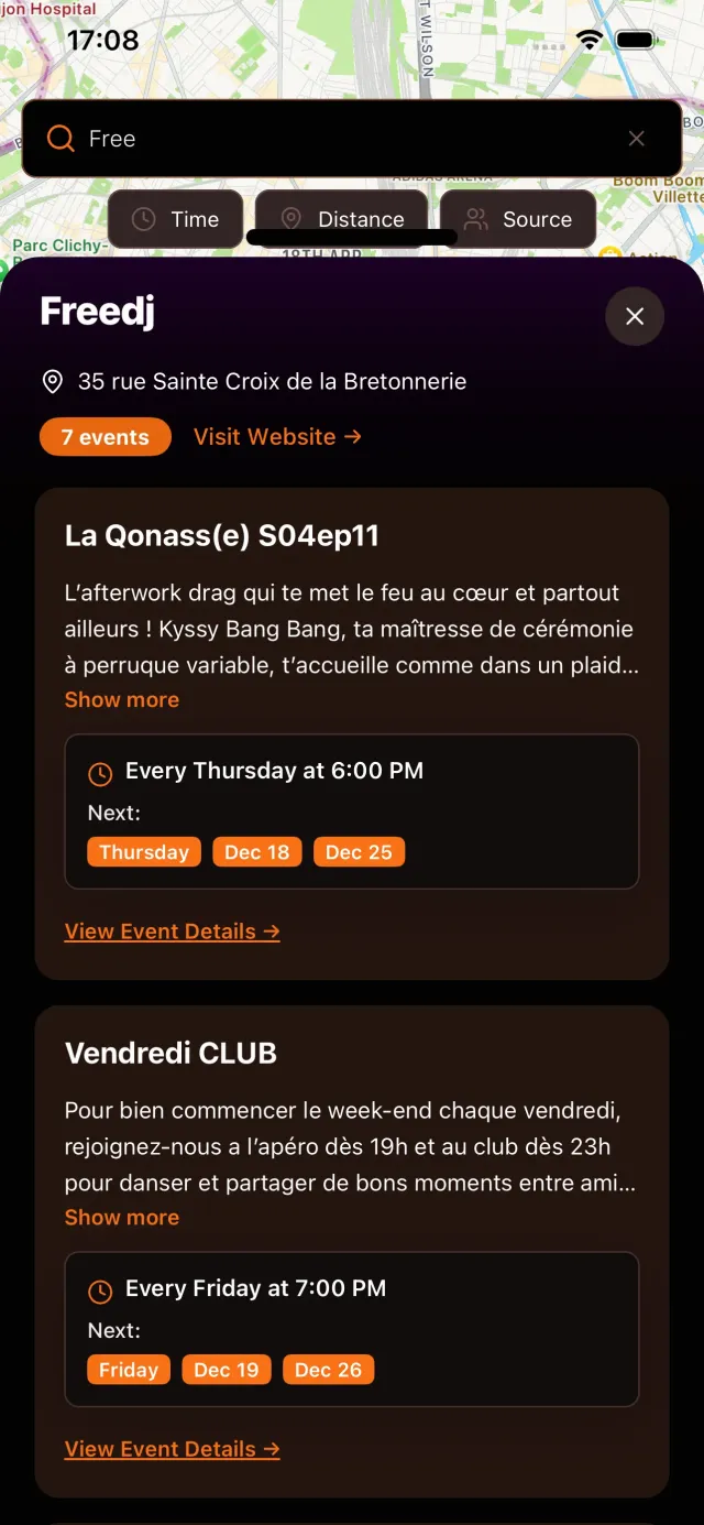 Find exactly what you're looking for. Filter events by time, or distance. Search by name and place. Whether you're into techno, art, or community gatherings, we've got you covered.